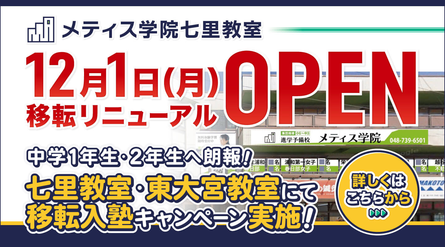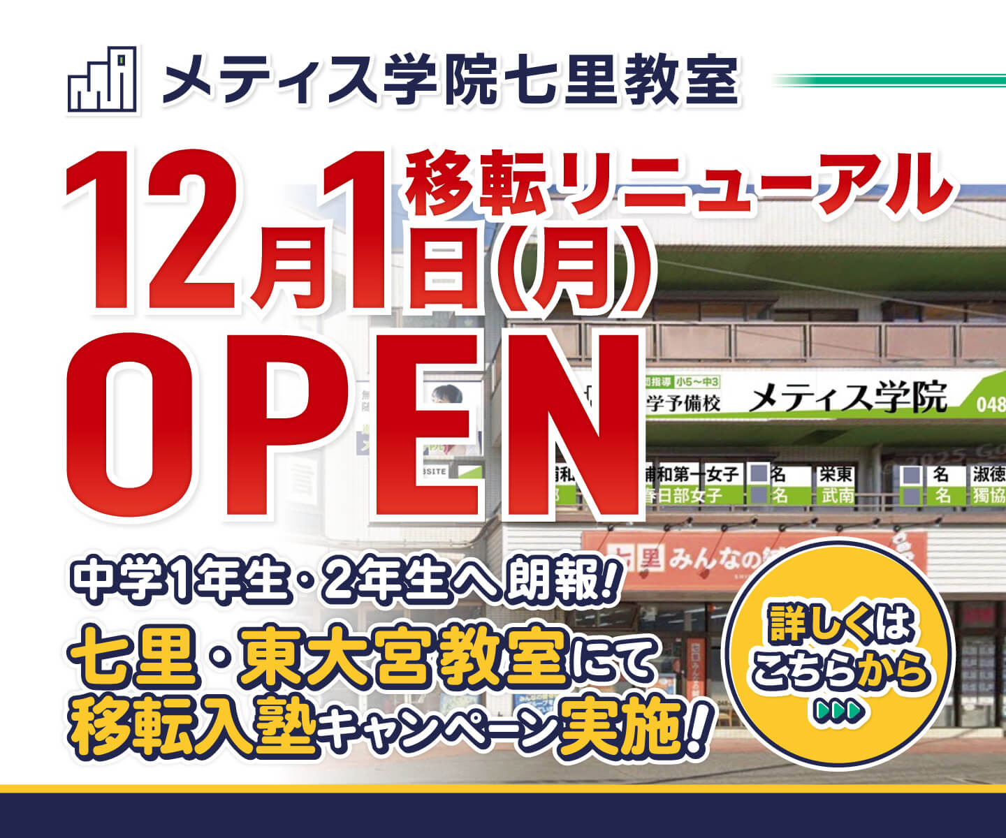 HOME 2025年2月28日 by metisgakuin sl_pc_12sl_pc_07sl_pc_05sl_pc_01 sl_mb_12sl_mb_07sl_mb_05sl_mb_01 中1〜中3 中学部 集団コース 第一志望合格にこだわった高校入試合格力を身につけるコース 中学部コース 2025年度合格実績 埼玉県公立高校および私立高校の合格実績をお知らせします。 小5・小6 小学部 集団コース 授業・演習・宿題のサイクルで基礎を確実に身につけるコース 小2〜小6 小学部 個別コース 生徒それぞれのペースで学習できる自立型学習コース 新着情報&お知らせ 新規入塾生受付中です!2025年11月1日 2学期期末テスト対策講座2025年10月15日 2025年度 夏期講習のお知らせ(終了)2025年8月2日 2025年度 春期講習のお知らせ(終了)2025年3月8日 2025年度 公立高校合格速報!2025年3月6日 無料体験・資料請求 お問い合わせフォーム お電話でも受付中です